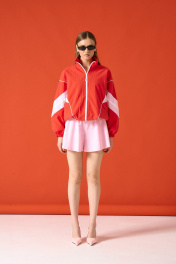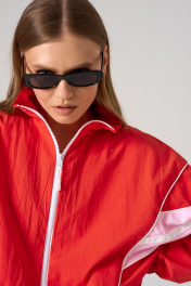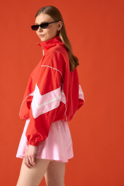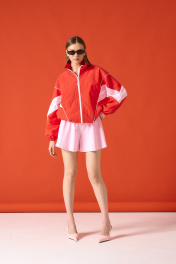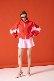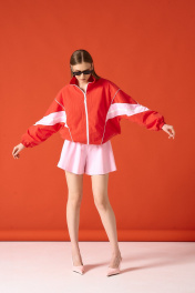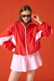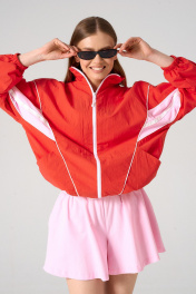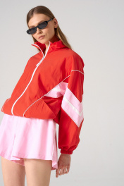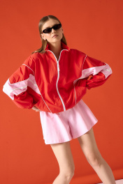 Олимпийка из хлопковой ткани алого цвета. Олимпийка с контрастными вставками из розового хлопка на рукавах. Застежка на молнию. Низ изделия на кулисе. Длина худи 64 см, длина рукава от воротника 70 см. 42-48 р-р ОГ 127-129 см Состав 100% хлопок