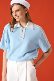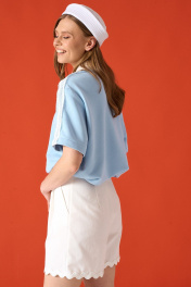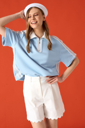 Шорты прямого свободного кроя. Низ изделия декорирован тесьмой. Пояс шорт стабильный, в боковых швах карманы. Длина шорт 44-46 см. Состав 72% хлопок, 26% пэ, 2% эластан