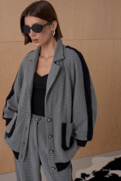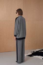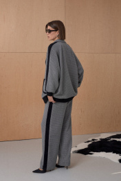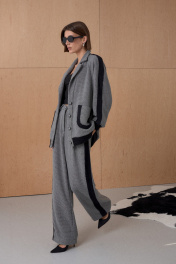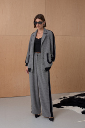 Брюки из твидовой ткани декорированы лентами в виде лампасов. Длина брюк см. Состав 73% ПЭ, 21% вискоза, 6% спандекс