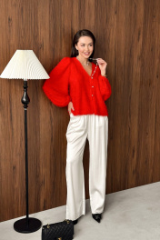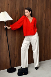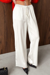 Брюки из вискозного полотна. Пояс на резинке дополнительно кулиса со шнуром. В боковых швах карманы и серебристый кант. Длина брюк 111 см. ОТ 42 р-р 64-66 см, 44 р-р 68-70 см, 46 р-р 72-74 см, 48 р-р 76-78 см. Соста 100% вискоза