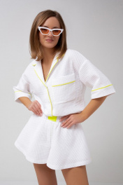Костюм двойка ( рубашка+шорты ) из приятной хлопковой ткани. Рубашка с застежкой на кнопки. Рукав короткий. Шорты с поясом с резинке внутри. В боковых швах карманы. В швах вставлен неоновый светоотражающий кант. Стильно и удобно! Длина рубашки 75 см Длина рукава от основания шеи 46 см Длина шорт 31 см