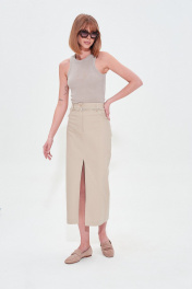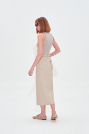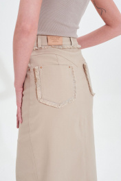 Юбка из хлопкового эластичного джинса. Изделие декорировано бахромой в тон основной ткани. Длина юбки 87 см