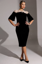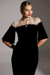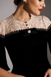В ожидании череды новогодних и рождественских мероприятий мы уже сейчас задумываемся о нарядах для каждой из Вас. Обратите внимание на это бархатное платье с ажурным гипюром от бренда "МОДА-ЮРС" - оно выглядит роскошно. Платье полуприлегающего силуэта с рельефами по переду и талиевыми вытачками по спинке. Спинка со средним швом, который переходит в шлицу. Платье по переду и спинке с кокетками, которые декорированы тесьмой. Рукав расширенный, по окату со сборкой. Застежка спереди на навесные петли-пуговицы. Платье на подкладке. Платье декорировано съемной брошью в форме банта. длина рукава : 39 см длина платья: 118 см