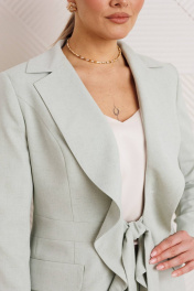 Облегченный костюм из натуральной ткани — это идеальный выбор для стильных и комфортных вечеринок или встреч. Двухпредметный комплект, состоящий из жакета и брюк. Жакет полуприлегающего силуэта с рельефами по переду, выходящими из проймы, отрезной деталью по линии талии в виде пояса, прорезными карманами с листочкой и клапанами по нижней части переда. Воротник английский, фантазийный, с лацканами, переходящими в воланы и завязывающимися поясами по линии талии. По спинке средний шов и отрезные бочки, создающие полуприлегающий силуэт. Рукава втачные, двухшовные. Жакет на подкладке. Брюки укороченные и слегка зауженные к низу. По передней и задней половинке брюк заутюженные стрелки. Пояс - кокетка, создающий хорошую посадку брюк по линии талии, с застежкой на молнию и пуговицу. длина жакета: 66 см длина брюк: 102 см