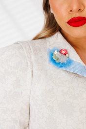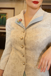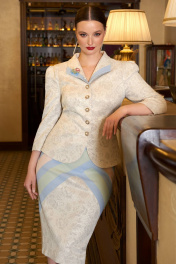 Безупречный силуэт, внимание к деталям - главные ценности бренда "Мода-Юрс", которые нашли отражение в костюме из жаккарда в полоску с акцентной брошью. Жакет прилегающего силуэта с рельефами по переду и спинке. Спинка со средним швом. Отрезная по линии талии. Рукав втачной, одношовный со складками по окату. Воротник с отрезной планкой. Застежка центральная. Юбка прямая зауженная к низу. Застежка на тесьму молнию в среднем шве, который переходит в шлицу. Сверху юбка на притачном поясе , по бокам с резинками. Костюм на подкладке. Костюм декорирован съемной брошью. длина жакета: 62 см длина рукава : 54 см длина юбки: 69,5 см