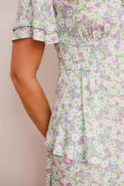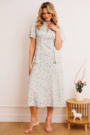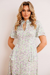 Платье из штапеля - прекрасный легкий вариант для жаркого лета. Платье приталенного силуэта, расширенное к низу. Отрезное по талии. По спинке молния в среднем шве. По переду небольшая сборка в области груди из подреза. В области бедер волан-баска из подреза, переходящий на спинку. Воротник - небольшая стойка с завязкой и вырезом капелькой. Рукав-волан двойной, разной длины. длина по спинке: 120 см