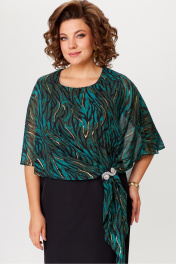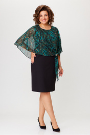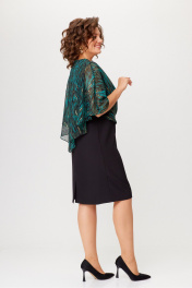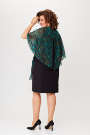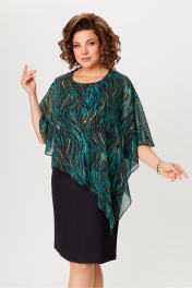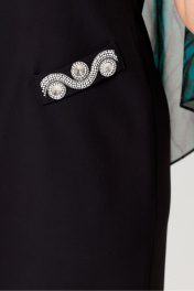 Платье женское полуприлегающего силуэта, без рукавов, без подкладки, тесьма-молния в среднем шве спинки. Перед с нагрудными вытачками, слева ниже линии талии пришита пата-клапан, украшена стразами. Спинка со средним швом, переходящим в шлицу, талиевые вытачки. Горловина обработана обтачкой. Пройма платья окантована косой бейкой. Пелерина отлетная треугольной формы: по спинке входит в средний шов, выше линии талии переходит в разрез, по переду продевается в пату.