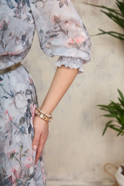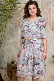 Платье женское отрезное, верхняя часть полуприлегающая, нижняя часть расклешенная, на подкладке, тесьмамолния в левом боковом шве. Перед и спинка отрезные по линии талии. Верхняя часть переда с нагрудными и талиевыми вытачками. Вырез горловины переда Vобразный. Верхняя часть спинки с талиевыми вытачками. Нижняя часть расклешенная. Горловина обработана обтачкой. Рукав одношовный, втачной, свободный, с притачной манжетой, присобрана на эластичную тесьму в несколько рядов. В качестве дополнения пояс съемный, из основной ткани фиксируется пряжкой. "