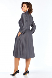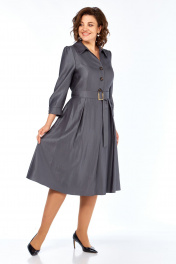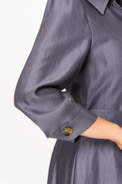 Платье женское полуприлегающего силуэта, расширенное к низу, без подкладки, лиф переда с центрально бортовой застежкой, застегивается на петли и пуговицы, тесьма-молния в левом боковом шве. Перед и спинка отрезные по линии талии. Верхняя часть переда с рельефами от проймы. На нижней части переда встречные складки на уровне рельефов, по центру заложена складка, закреплена отделочной складкой, до уровня бедер. Верхняя часть спинки с талиевыми вытачками. На нижней части спинки встречные складки на уровне талиевых вытачек, средний шов. На уровне линии талии по боковому шву настрочены шлевки, для пояса. Горловина спинки обработана обтачкой. Горловина и край борта переда обработаны планками и подбортом. Воротник стояче отложной с отрезной стойкой. Рукав одношовный, втачной, свободный, окат присобран на сборку, по низу рукава заложены две складки, притачная манжета застегивается на петлю и пуговицу. В дополнении пояс из основной ткани, фиксируется пряжкой.