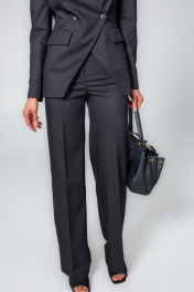 Комплект, состоящий из двубортного жакета и брюк. Выполнен из костюмной ткани с эластаном. Жакет полуприлегающего силуэта на подкладке, с прорезными карманами, без воротника. Застегивается на две петли и пуговицы. Перед с вытачками и рельефами, по спинке средний шов и рельефы. Рукав втачной двухшовный. Брюки-палаццо умеренной ширины, со стрелками, на притачном поясе, с застежкой на молнию в гульфике и пуговицу с петлей на поясе, в пояс вставлены шлевки. По задней части брюк талиевые вытачки. У данной модели универсальная посадка на уровне линии талии. Данный комплект - это базовая модель, с которой можно составить много разнообразных образов.