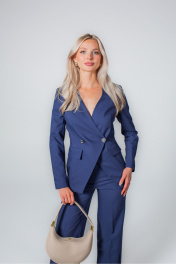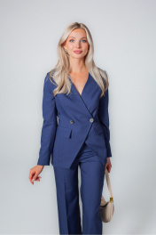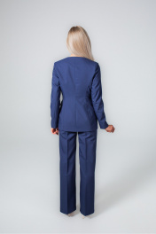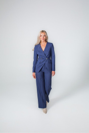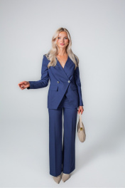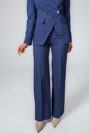Комплект, состоящий из двубортного жакета и брюк. Выполнен из костюмной ткани с эластаном. Жакет полуприлегающего силуэта на подкладке, с прорезными карманами, без воротника. Застегивается на две петли и пуговицы. Перед с вытачками и рельефами, по спинке средний шов и рельефы. Рукав втачной двухшовный. Брюки-палаццо умеренной ширины, со стрелками, на притачном поясе, с застежкой на молнию в гульфике и пуговицу с петлей на поясе, в пояс вставлены шлевки. По задней части брюк талиевые вытачки. У данной модели универсальная посадка на уровне линии талии. Данный комплект - это базовая модель, с которой можно составить много разнообразных образов.