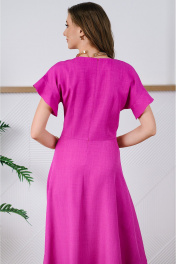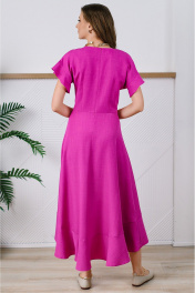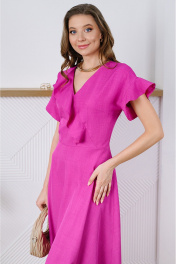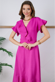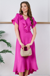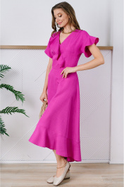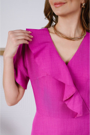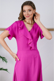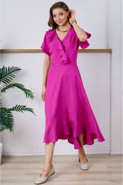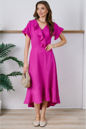 Платье полуприлегающего силуэта отрезное по талии. Выполнено из непрозрачной плательной вискозосодержащей ткани, без подкладки. Перед лифа асимметричный с имитацией запаха, воланом, нагрудными и талиевыми вытачками. Спинка лифа со средним швом и талиевыми вытачками. Юбка расклешенная с воланом по низу. По переду платье короче, чем по спинке. Рукав короткий цельнокроеный с воланом. Вырез по переду V-образный. Застежка на потайную молнию в среднем шве спинки.