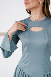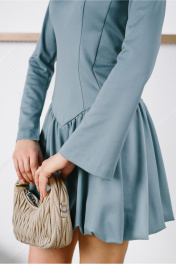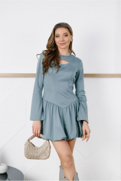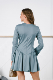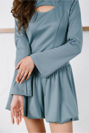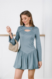 Платье-мини прилегающего силуэта отрезное чуть ниже линии талии, с декоративной прорезью на груди. Выполнено из непрозрачного плательного вискозосодержащего, формоустойчивого трикотажного полотна. Юбка на трикотажной подкладке. Перед лифа с рельефами и кокеткой. Спинка лифа со средним швом и рельефами. Низ лифа оформлен фигурной линией. Кокетка скреплена с передом таким образом, что по левой стороне она спрятана под основной деталью. Юбка-баллон со сборкой по верхнему и нижнему срезу. Рукав расклешенный втачной длинный одношовный с разрезом. Вырез горловины округлый. Застежка на потайную молнию в среднем шве спинки.