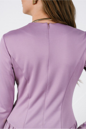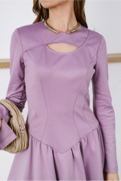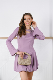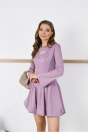 Платье-мини прилегающего силуэта отрезное чуть ниже линии талии, с декоративной прорезью на груди. Выполнено из непрозрачного плательного вискозосодержащего, формоустойчивого трикотажного полотна. Юбка на трикотажной подкладке. Перед лифа с рельефами и кокеткой. Спинка лифа со средним швом и рельефами. Низ лифа оформлен фигурной линией. Кокетка скреплена с передом таким образом, что по левой стороне она спрятана под основной деталью. Юбка-баллон со сборкой по верхнему и нижнему срезу. Рукав расклешенный втачной длинный одношовный с разрезом. Вырез горловины округлый. Застежка на потайную молнию в среднем шве спинки.