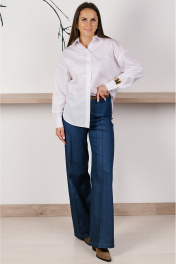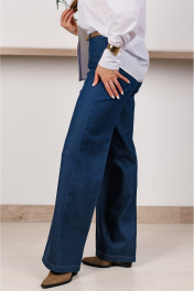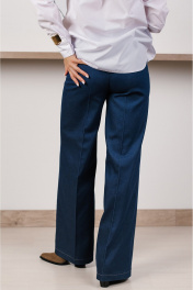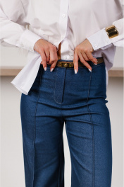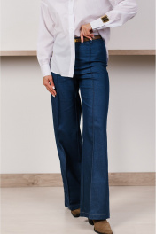 Брюки-палаццо умеренной ширины, с отстроченными по переду стрелками, на притачном поясе, с застежкой на молнию в гульфике и пуговицу с петлей на поясе, в пояс вставлены шлевки. По задней части брюк талиевые вытачки. Брюки выполнены из джинсовой ткани с преобладанием хлопка в составе. Все отделочные строчки проложены контрастной нитью. У данной модели универсальная посадка на уровне линии талии.