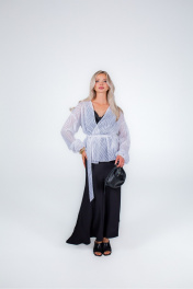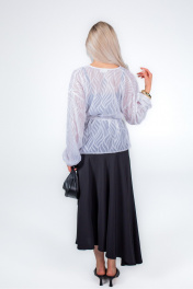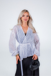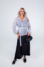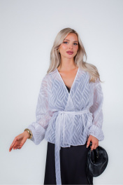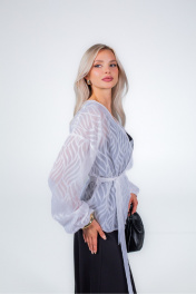 Жакет из плотного формоустойчивого шифона, без подкладки, без застежки и без воротника. Линия плечевого шва удлиненная. Рукав одношовный с резинкой по низу. По боковым швам разрезы. В комплекте съемный завязывающийся пояс. Благодаря отсутствию застежки, степень прилегания и объем жакета можно регулировать самостоятельно.