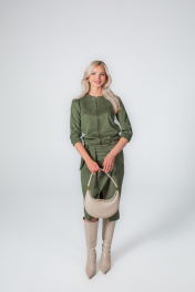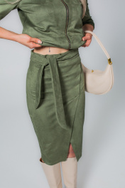 Комплект, состоящий из жакета на молнии и юбки. Выполнен из непрозрачной высококачественной замши на трикотажной основе. Жакет прямого силуэта, по низу манжета с резинкой, по горловине в бейку также втянута резинка. Без подкладки, карманов и воротника. Перед с нагрудными вытачками. Рукав втачной одношовный с манжетой на резинке. Юбка-карандаш длиной чуть ниже колена, без подкладки. По переду имитация запаха. По спинке в среднем шве застежка на потайную молнию. В боковые швы вставлен завязывающийся пояс.
