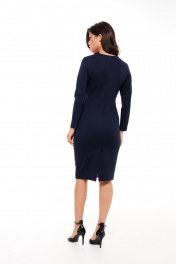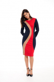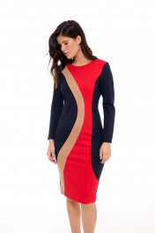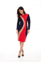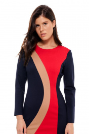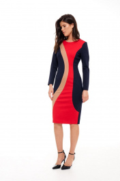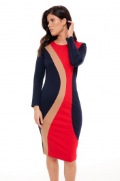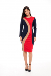 Платье без подкладки,прилегающего силуэта,прямое зауженное к низу,длиной до середины колена.Спинка со средним швом и талиевыми вытачками,сверху молния,снизу разрез-шлица.Платье выполнено из трикотажного полотна в сочетании трёх цветов.По переду фигурные рельефы,формирующие детали из разных цветов.Горловина круглая,обработана обтачками,рукав прямой длинный,двухшовный.Платье без карманов. Длина по спинке: р.42-105 см, р.44-105 см,р.46-106 см, р.48-107см, р 50-107см, р 52-107см,р.54-108 см. Длина Рукава: р.42-59см, р.44-59см, р.46-59см, р.48-60см, р.50-60см, р.52-60см,р.54-60 см.