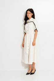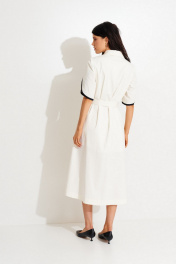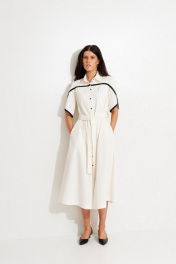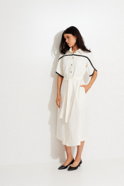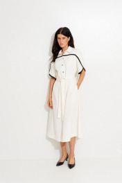 Платье из смесовой ткани, А-силуэта, длиной мидакси. Воротник рубашечный. По переду отрезная кокетка с контрастной бейкой, небольшая сборка, застежка на пуговицы. На спинке вверху заложена встречная складка. Подол платья разноуровневый. В боковых швах выполнены разрезы и карманы. Рукав рубашечный из двух деталей, с фигурным низом и контрастной бейкой по низу. Пояс съемный, так-же с настроченной котрастной бейкой.