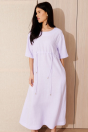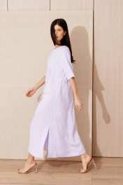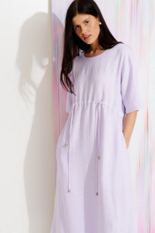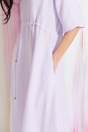 Платье из льняной ткани, А-силуэта. Длина мидакси. Высрез круглый. Плечо спущенное, рукав прямой до локтя. По переду и спинке кулиска. В боковых швах выполнены карманы и разрезы. В среднем шве спинки застестежка -молния.
