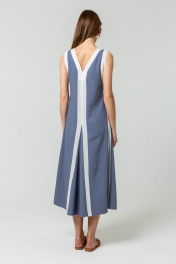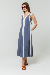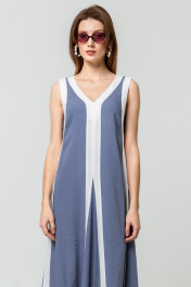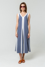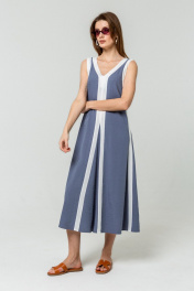 Сарафан из плательной ткани А-силуэта, и расширенной юбкой длиной мидакси. По переду и спинке вырезы V-образной формы, а так-же отделочные контрастные вертикальные детали, между которыми втачены клинья.