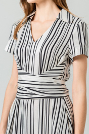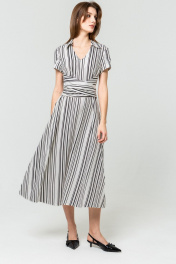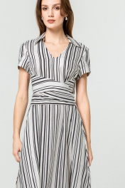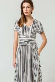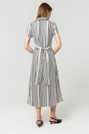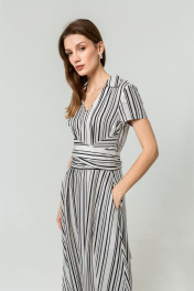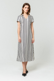 Платье длиной мидакси, полуприлегающего силуэта, с коротким рукавом. По переду лифа расположены нагрудные вытачки. По среднему шву спинки застёжка на тесьму-молнию. Платье отрезное по линии талии. По юбке платья - складки. В боковых швах - карманы.