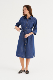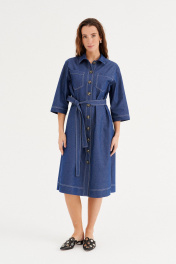 Платье из хлопковой ткани, прямого силуэта, длиной миди. Воротник рубашечного типа. По переду отрезная планка с застежкой на пуговицы, накладные карманы. Рукав двухшовный, рубашечный, длиной 3/4. В бококовых швах выполнены каманы , а внизу разрезы. По спинке кокетка и бантовая складка. Имеется съемный пояс.