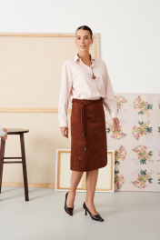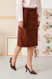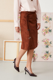 Юбка из эко замши на трикотажной основе на подкладке, слегка расширенная к низу, длиной до колена. Пояс на резинке. Имеется съемный фантазийный пояс.