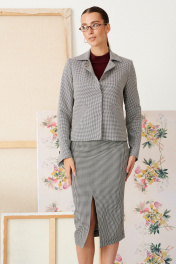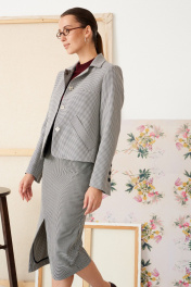 Жакет из костюмной ткани, на подкладке, полуприлегающего силуэта, длинной до линии бедер. Воротник пиджачного типа. По переду застежка на кнопки и наклонные прорезные карманы с листочкой. Рукав полной длинны с фигурным низом и высоким разрезам, застегивающимся на отделочные пуговицы. По спинке средний шов.