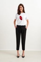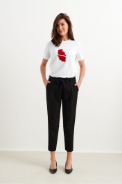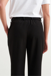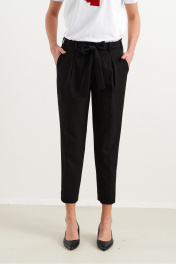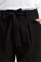 Брюки-бананы из смесового текстиля Сзади по линии талии идет резинка Передние половинки с заложенной складкой По бокам наклонные карманы В комплекте пояс из ткани основы