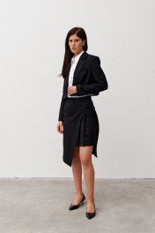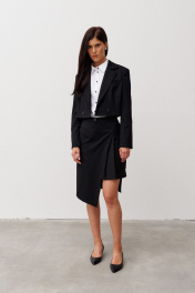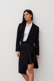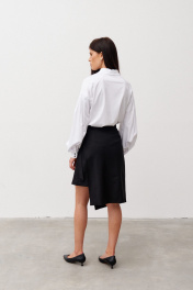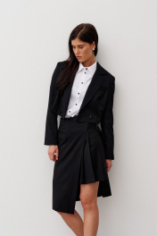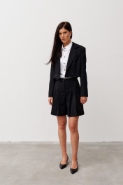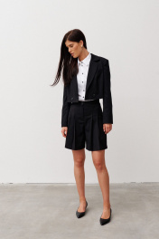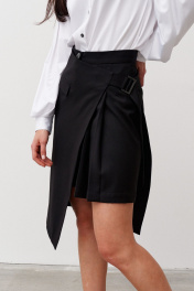 Шорты из смесовой ткани, длиной выше колена, с притачным поясом , складками по переду и съемной декоративной деталью имитирующей юбку. Застежка впереди на молнию и пуговицу. В боковых швах выполнены карманы. Деталь на подкладке. Застегивается на пояс с пряжкой. По переду выполнена имитация кармана с клапаном в рамку.