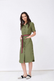 - платье-рубашка прямого силуэта с застёжкой до низа; - по переду два накладных кармана; - отложной воротник- стойка, внутренняя стойка из отделочной ткани; - на спинке горизонтальная пата до линии талии с пуговицей; - низ изделия фигурный с разрезами и шлицей застёгивающейся на декоративные пуговицы; - пояс широкий комбинированный из основной и отделочной ткани;