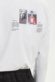 Базовый лонгслив из плотного трикотажа с хлопком. Спереди и сзади дизайнерские принты с небольшой надписью и фотографиями исторических личностей. Отличный вариант для офиса под жакет и на каждый день