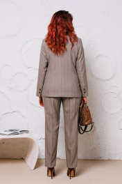 Костюм женский, состоящий из жакета, жилета и брюк, из текстильной ткани. Жакет полуприлегающего силуэта на подкладке, по переду рельефные швы, функциональные прорезные карманы в рамку с клапаном, центральная застежка на петли и пуговицы. Горловина оформлена воротником пиджачного типа с отрезной стойкой и лацканами. Спинка со средним швом и рельефными швами. Рукава втачные, двухшовные, со шлицами по низу, отделочными петлями и пуговицами. Жилет полуприлегающего силуэта на подкладке. По переду рельефные швы, листочки, застежка на петли и пуговицы, низ фигурный. Горловина оформлена V-образным вырезом. Спинка со средним швом и рельефными швами. Брюки прямого силуэта с высокой посадкой. На передних половинах небольшие мягкие складки, заутюжены стрелки, в боковых швах наклонные карманы, по срезу банта – застежка – молния. Задние половинки с талиевыми вытачками. Верхний срез оформлен поясом, с эластичной резинкой по задней половинке. Длина жакета по спинке – 70 см. Длина рукава – 61 см. Длина жилета по спинке – 51,5 см. Длина брюк по боковому шву с поясом – 105 см. 44р – жакет – ОГ 98, ОТ 92, ОБ 106, ширина рукава 37; жилет – ОГ 98, ОТ 86, ОБ 96; брюки – ОТ 76/88, ОБ 104 46р – жакет – ОГ 102, ОТ 96, ОБ 110, ширина рукава 38; жилет – ОГ 102, ОТ 90, ОБ 100; брюки – ОТ 80/92, ОБ 108 48р – жакет – ОГ 106, ОТ 100, ОБ 114, ширина рукава 39; жилет – ОГ 106, ОТ 94, ОБ 104; брюки – ОТ 84/96, ОБ 112 50р – жакет – ОГ 110, ОТ 104, ОБ 118, ширина рукава 40; жилет – ОГ 110, ОТ 98, ОБ 108; брюки – ОТ 88/100, ОБ 116 52р – жакет – ОГ 114, ОТ 108, ОБ 122, ширина рукава 41; жилет – ОГ 114, ОТ 102, ОБ 112; брюки – ОТ 92/104, ОБ 120 54р – жакет – ОГ 118, ОТ 112, ОБ 126, ширина рукава 42; жилет – ОГ 118, ОТ 106, ОБ 116; брюки – ОТ 96/108, ОБ 124