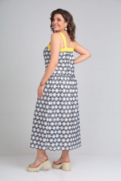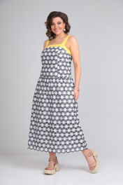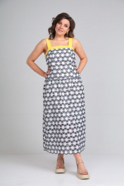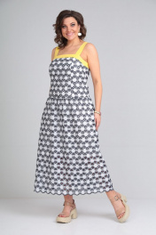 Платье-сарафан из хлопка «шитье» (не тянется) полуприлегающего силуэта на бретелях из контрастной отделочной ткани. Сарафан на хлопковой подкладке. Сарафан отрезной чуть ниже линии талии. Низ присборен по шву притачивания. По лифу переда рельефные швы и притачная планка из отделочной контрастной ткани желтого цвета. По лифу спинки средний шов и притачная планка из отделочной контрастной ткани, присборенной с помощью резинки. Длина по среднему шву спинки от планки во всех р-ах -114 Ширина спинки по планке во всех р-ах -42 ОГ ½ - р46-51, р48-53, р50-55 ОТ ½ - р46-46, р48-48, р50-50 ОБ ½ - р46-56, р48-58, р50-60