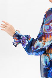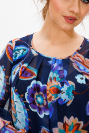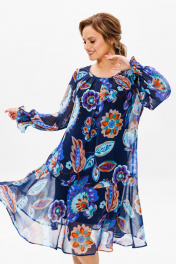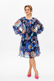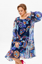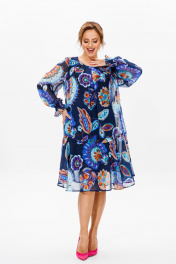 Платье женское трапециевидного силуэта на съемной подкладке. Выполнено из шифона (не тянется), подкладка из креп-шифона (не тянется). Вырез горловины круглый, со встречными складками по переду, по спинке на завязке, обработан окантовкой. Рукав втачной, по низу собран на «венгерку» в несколько рядов. По низу платья отрезной волан. Длина платья по среднему шву спинки р48,50 – 97, р52,54,56 – 102, р58,60,62 - 103 Длина рукава во всех р-ах -62 Ширина рукава на уровне глубины проймы ½ - 48-20,5, р50-21, р52-22,5, р54-23, р56-23,5, р58-24, р60-24,5, р62-25 ОГ ½ -р48-56, р50-58, р52-64, р54-66, р56-68, р58-70, р60-72, р62-74 ОТ ½ - р48-58, р50-60, р52-67, р54-69, р56-71, р58-73, р60-75, р62-77 ОБ ½ - р48-64, р50-66, р52-70, р54-72, р56-74, р58-76, р60-78, р62-80 Нижнее платье (подкладка): Длина подкладки по среднему шву спинки – р48, 50 – 74, р52,54,56-81, р58,60,62 - 82 ОГ ½ - р48-54, р50-56, р52-58, р54-60, р56-62, р58-64, р60-66, р62-68 ОТ ½ - р48-50, р50-52, р52-56, р54-58, р56-60, р58-62, р60-64, р62-66 ОБ ½ - р48-56, р50-58, р52-60, р54-62, р56-64, р58-66, р60-68, р62-70