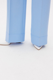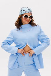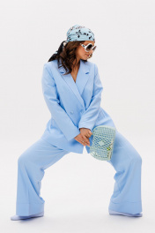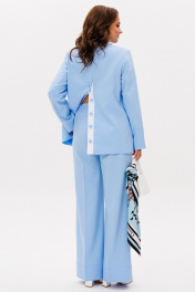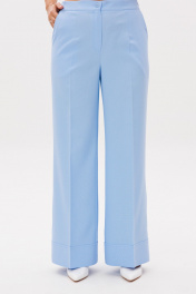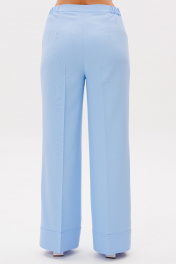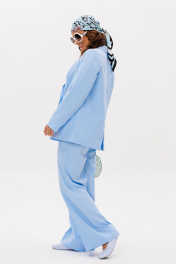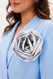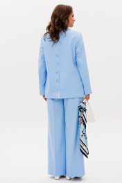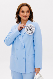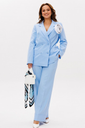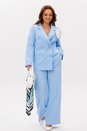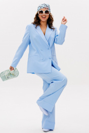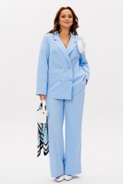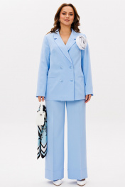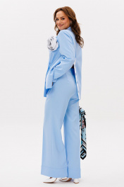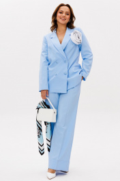 Стильный женский костюм, состоящий из жакета и брюк, выполнен из костюмной ткани (тянется). Жакет прямого кроя на подкладке. По переду нагрудные вытачки, функциональные карманы с листочкой, центральная двубортная застежка на петли-пуговицы. Горловина оформлена воротником пиджачного типа с лацканом. Спинка со средним швом, шлицей-планкой из отделочной ткани, застегивающейся на петли-пуговицы. Рукава втачные, двухшовные. Жакет декорирван съемным цветком из отделочной ткани. Брюки прямого, свободного кроя с высокой посадкой, с наклонными карманами в боковых швах, по срезу банта – застежка-молния. По передним половинкам талиевые вытачки. По низу брюк отрезные манжеты.