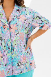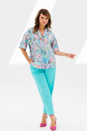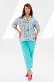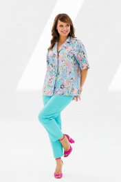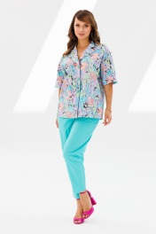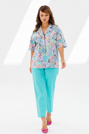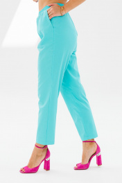 Стильный женский костюм, состоящий из жакета и брюк. Жакет прямого силуэта со спущенной линией плеча, выполненный из хлопковой ткани (тянется). По переду функциональные прорезные карманы с листочкой, централная застежка на петли-пуговицы. Горловина оформлена воротником пиджачного типа с лацканом. Спинка со средним швом. Рукава одношовные, короткие. Жакет без подкладки. Длина жакета по среднему шву спинки – р48,50,52 – 66, р54,56,58 – 67 Длина рукава во всех р-ах – 23 Ширина рукава на уровне глубины проймы 1/2 – р48-23, р50-23,5, р52-24, р54-24,5, р56-25, р58-25,5 Ширина рукава внизу ½ - р48-19,5, р50-20, р52-20,5, р54-21, р56-21,5, р58-22 ОГ ½ - р48-58, р50-60, р52-62, р54-64, р56-66, р58-68 ОТ ½ - р48-55, р50-57, р52-59, р54-61, р56-63, р58-65 ОБ ½ - р48-58, р50-60, р52-62, р54-64, р56-66, р58-68 Брюки зауженные к низу с высокой посадкой, выполненные из костюмного полотна «Лен» (не тянется). В боковых швах наклонные карманы. Верхний срез оформлен поясом с эластичной резинкой. Длина брюк по боковому шву во всех р-ах – 102 Длина брюк по внутреннему шву во всех р-ах – 72,5 Ширина брюк внизу ½ - р54-19,5, р56-20, р58-20,5 ОТ с раст резинкой (max) ½ - р54-55, р56-57, р58-59 ОБ ½ - р54-60, р56-62, р58-64 Высота посадки спереди во всех р-ах – 32 Высота посадки сзади во всех р-ах – 47