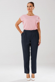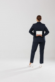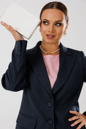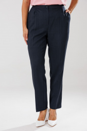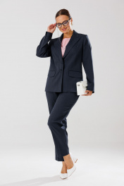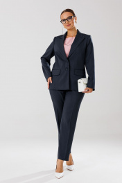 Костюм женский, состоящий из жакета, блузы и брюк. Жакет полуприлегающего силуэта на подкладке, по переду рельефные швы, функциональные прорезные карманы в рамку с клапаном, центральная застежка на петли и пуговицы. Горловина оформлена воротником пиджачного типа с отрезной стойкой и лацканами. Спинка со средним швом и рельефными швами. Рукава втачные, двухшовные, со шлицами по низу, отделочными петлями и пуговицами. Брюки прямого силуэта с высокой посадкой. На передних половинах небольшие мягкие складки, заутюжены стрелки, в боковых швах наклонные карманы, по срезу банта – застежка – молния. Задние половинки с талиевыми вытачками. Верхний срез оформлен поясом с эластичной резинкой по задней половинке. Блуза полуприлегающего силуэта из креп-шифона (тянется) со спущенной линией плеча. По переду нагрудные вытачки. По спинке средний шов. Вырез горловины «Лодочка». В боковых швах небольшие разрезы. Длина жакета по спинке – р44,46,48 – 67, р50,52,54 - 71. Длина рукава – 61 см. Длина блузы по спинке – р44,46,48 - 61см, р50,52,54 - 62. Длина брюк по боковому шву с поясом – р44,46,48 – 103 см, р50,52,54 - 105 см. Длина брюк по внутреннему шву во всех размерах – 74 см. 44р – жакет – ОГ 100, ОТ 94, ОБ 108, ширина рукава 37; блуза – ОГ 102, ОТ 94, ОБ 102; брюки – ОТ 76/92, ОБ 104 46р – жакет – ОГ 104, ОТ 98, ОБ 112, ширина рукава 38; блуза – ОГ 106, ОТ 98, ОБ 106; брюки – ОТ 80/96, ОБ 108 48р – жакет – ОГ 108, ОТ 102, ОБ 116, ширина рукава 39; блуза – ОГ 110, ОТ 102, ОБ 110; брюки – ОТ 84/100, ОБ 112 50р – жакет – ОГ 112, ОТ 106, ОБ 120, ширина рукава 40; блуза – ОГ 114, ОТ 106, ОБ 114; брюки – ОТ 88/104, ОБ 116 52р – жакет – ОГ 116, ОТ 110, ОБ 124, ширина рукава 41; блуза – ОГ 118, ОТ 110, ОБ 118; брюки – ОТ 92/108, ОБ 120 54р – жакет – ОГ 120, ОТ 114, ОБ 128, ширина рукава 42; блуза – ОГ 122, ОТ 114, ОБ 122; брюки – ОТ 96/112, ОБ 124