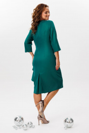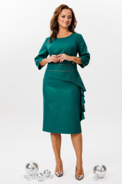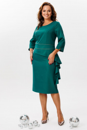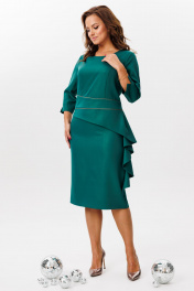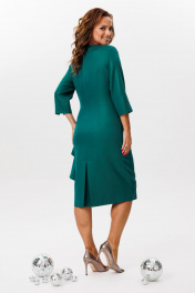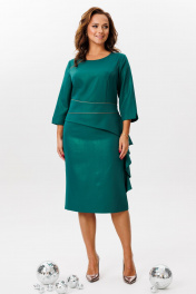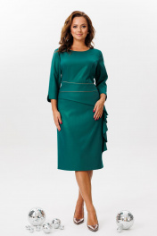 Нарядное платье, выполненное из плательной ткани с легким блеском (тянется). По переду ассиметричный отрезной пояс с отделочным кантом. Верхняя часть переда с рельефными швами. По нижней части переда – баска, переходящая в волан. Спинка со средним швом, талиевыми вытачками и бантовой складкой по нижней части. Застежка на потайную тесьму-молнию в среднем шве спинки. Горловина округлой формы. Рукава втачные, одношовные с разрезами по низу.