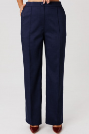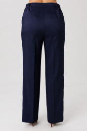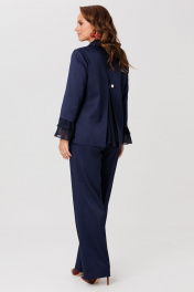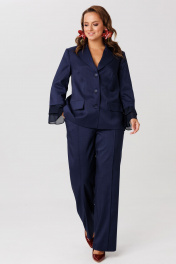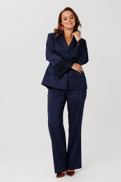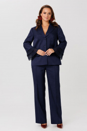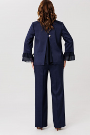 Костюм женский, состоящий из жакета и брюк, выполнен из костюмного полотна (чуть тянется). Жакет прямого силуэта с нагрудными вытачками по переду. Накладные клапаны, являются имитацией кармана. По горловине воротник с отложными бортами пиджачного типа. Застежка на три петли-пуговицы. По спинке центральный разрез эффектно оформлен декоративной вставкой из струящегося шифона, который дополняет отделочная пуговица (не функциональная при застегивании). Рукав втачной, двухшовный, длина 7/8. По низу рукава два притачных волана из шифоновой ткани. Жакет на подкладке. Брюки свободного кроя с высокой посадкой. В боковых швах функциональные карманы. Верхний срез брюк обработан притачным поясом с резинкой в боковых швах. Застежка в брюках на тесьму-молнию.