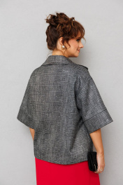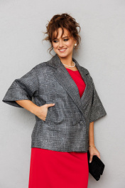 Нарядный женский комплект, состоящий из жакета и платья. Жакет прямого силуэта на подкладке со спущенной линией плеча, выполнен из костюмной ткани, расшитой пайетками (тянется). По переду функциональные прорезные карманы с листочкой, центральная двубортная застежка на петли-пуговицы. Горловина оформлена вортником пиджачного типа с лацканом. Спинка цельная. Рукава одношовные с притачной манжетой. Платье полуприлегающего силуэта со спущенной линией плеча, выполненное из плательной ткани (тянется) без подкладки. По переду нагрудные вытачки. Спинка со средним швом, талиевыми вытачками и разрезом по низу. Застежка на потайную тесьму-молнию в среднем шве спинки. Горловина округлой формы, обработана окантовкой.