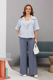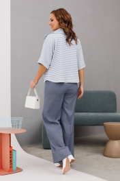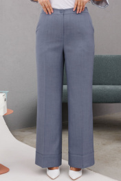 Костюм женский, состоящий из жакета и брюк. Жакет прямого силуэта без подкладки, выполнен из трикотажного полотна (тянется). По переду накладные карманы, центральная застежка на кнопку и отделочную пуговицу. Горловина оформлена воротником пиджачного типа с лацканом. Рукава покроя «Реглан» с отложными манжетами. Брюки прямого кроя с высокой посадкой, с наклонными карманами в боковых швах, по срезу банта – застежка-молния. По передним половинкам талиевые вытачки. По низу брюк отложные манжеты. Верхний срез оформлен поясом с эластичной резинкой по задней половинке.