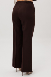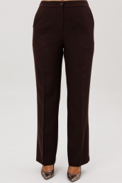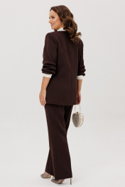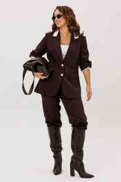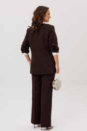 Жакет полуприлегающего силуэта, выполнен из костюмной ткани (не тянется) с отделкой из довяза на подкладке. Перед с нагрудными вытачками и настрочными клапанами. Застежка центральная на петли-пуговицы. Горловина оформлена воротником пиджачного типа с лацканом. Спинка со средним швом. Рукава втачные, двухшовные с мягкими складками и манжетой из довяза. Брюки свободного прямого кроя с высокой посадкой из костюмной ткани (тянется). В боковых швах функциональные карманы. По срезу банта – застежка-молния. Верхний срез оформлен поясом с эластичной резинкой по задней половинке.