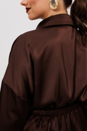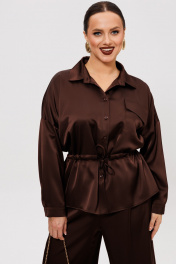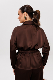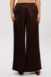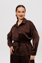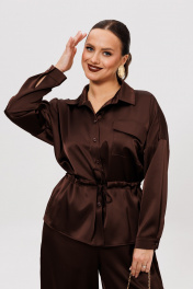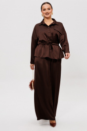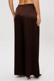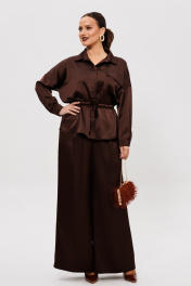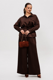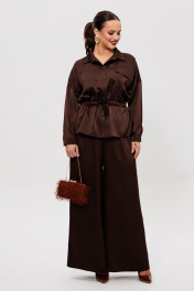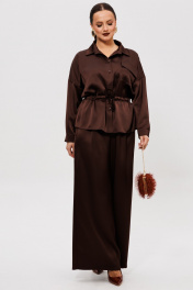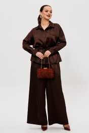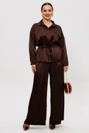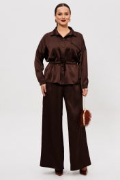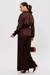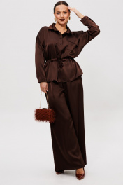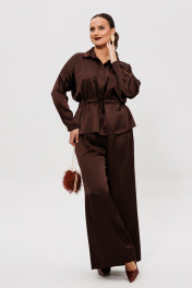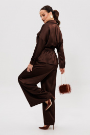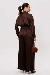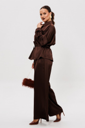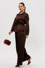 Нарядный брючный костюм, выполненный из струящегося шелка «Армани» (тянется). Блуза прямого силуэта со спущенной линией плеча. По переду накладной карман с клапаном (по правой части переда), центральная застежка на петли-пуговицы, настрочные кулисы со шнуром. Спинка цельная с настрочной кулисой, присборенная резинкой. Горловина оформлена воротником рубашечного типа со стойкой. Рукава одношовные с притачной манжетой, застегивающейся на пуговицы. Брюки свободного прямого кроя с высокой посадкой. Верхний срез оформлен поясом с эластичной резинкой.