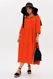 Стильное женское платье свободного силуэта, выполнено из плательной ткани (чуть тянется). Платье отрезное чуть выше линии талии. Верхняя часть переда с V-образным вырезом и цельнокроенными планками. Горловина оформлена рюшей, присборенной резинкой с завязками. По нижней части платья два ряда присборенных воланов. Рукава втачные одношовные, по низу собраны на резинку. Платье без подкладки