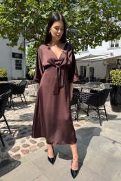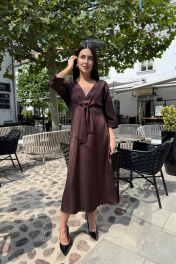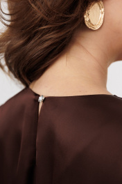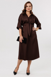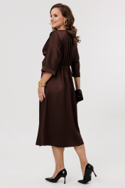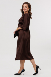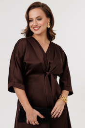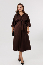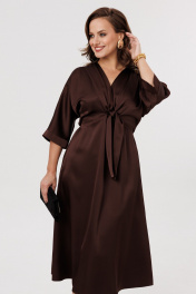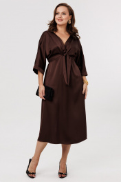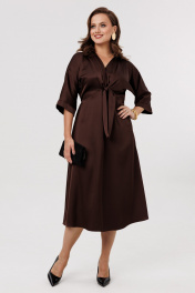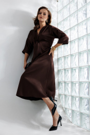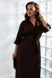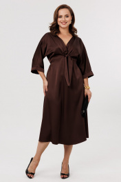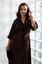 Нарядное женское платье, выполненное из струящегося шелка «Армани» (тянется), без подкладки. Платье отрезное выше линии талии. Верхняя часть покроя «Летучая мышь», нижняя часть – «полусолнце». Лиф переда с фигурным подрезом и мягкой складкой от линии плеча, переходящей в линию пояса. Завязывающегося под грудью. Лиф спинки со средним швом, с застежкой на навесную петлю-пуговицу. По линии подреза спинка присборена резинкой. По низу рукавов – притачные манжеты. Платье без карманов.