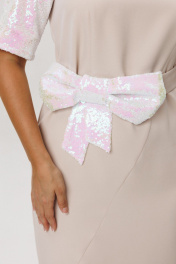 Нарядное женское платье, выполненное из двух видов ткани: плательно-костюмной (тянется ) и плательной с пайетками (тянется). Платье полуприлегающего силуэта, покроя «Реглан». По переду ассиметричный подрез, переходящий в рельеф. Рельеф переходит в талиевую вытачку. По спинке средний шов, потайная застежка-молния и талиевые вытачки. Низ переда и спинки фигурной формы с разрезом по переду. Горловина округлой формы. Рукава-реглан со швом по середине и на подкладке. Само платье без подкладки. В комплект входит съемный пояс, выполненный из основной ткани, декорированный пышным бантом из пайеток.