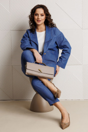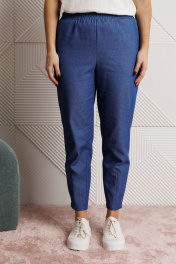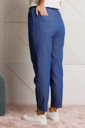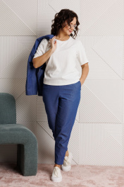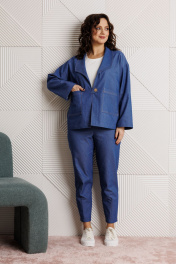 Костюм 3-ка, состоящий из жакета, брюк и блузы. Жакет прямого силуэта «оверсайз» со спущенной линией плеча, выполнен из джинсовой ткани (тянется). По переду накладные карманы. Застежка встык на хлястик и отделочную пуговицу. Горловина с глубоким отворотом, оформлена воротником типа «Шаль». Рукав одношовный. Длина жакета по среднему шву спинки – р50,52 – 63, р54,56,58 – 64, р60- 68 Длина рукава – р50,52 – 48, р54,56,58,60 – 49 Ширина рукава на уровне глубины проймы ½ - р50-22, р52-22,5, р54-23, р56-23,5, р58-24, р60-24,5, Ширина рукава внизу ½ - р50-18, р52-18,5, р54-19, р56-19,5, р58-20, р60-20,5 ОГ ½ - р50-62, р52-64, р54-66, р56-68, р58-70, р60-72 ОТ ½ - р50-62, р52-64, р54-66, р56-68, р58-70, р60-72 ОБ ½ - р50-62, р52-64, р54-66, р56-68, р58-70, р60-72 Блуза полуприлегающего силуэта из эластичного вискозного полотна (тянется). Горловина круглая, оформлена притачной бейкой, рукава втачные, одношовные. Длина спинки блузы по среднему шву р50-52 – 56, р54-56-58 – 59, р60 – 64 Длина рукава – р50-58 – 25, р60 - 26 Ширина рукава на уровне глубины проймы ½ -р50-19, р52-19,5, р54-20, р56-20,5, р58-21, р60-21,5 Ширина рукава внизу ½ - р50-18, р52-18,5, р54-19, р56-19,5, р58-20, р60-20,5 ОГ ½ - р50-53, р52-55, р54-57, р56-59, р58-61, р60-63 ОТ ½ - р50-50, р52-52, р54-54, р56-56, р58-58, р60-60 ОБ (по линии низа) ½ - р50-55, р52-57, р54-59, р56-61, р58-63, р60-65 Брюки зауженные книзу с высокой посадкой, выполнены из джинсовой ткани (тянется). Верхний срез оформлен поясом с эластичной резинкой. Низ брюк с застроченными вытачками. В боковых швах наклонные карманы. По задним половинкам отрезные кокетки и накладные карманы. Длина брюк по боковому р50,52– 97, р54,56,58 – 98, р60 - 100 Длина брюк по внутреннему шву р50,52 – 69, р54,56,58 – 68, р60– 70 Ширина брюк внизу ½ - р50-16,5, р52-17, р54-17,5, р56-18, р58-18,5, р60-20,5 Высота посадки спереди р50,52 – 30, р54,56,58 – 32,5, р60 - 35 Высота посадки сзади р50,52 – 44, р54,56,58 – 47, р60 – 50 ОТ с раст резинкой (max) ½ - р50-52, р52-54, р54-56, р56-58, р58-60, р60-62 ОБ ½ -р50-55, р52-57, р54-59, р56-61, р58-63, р60-65