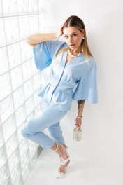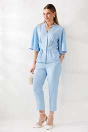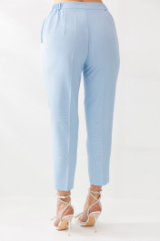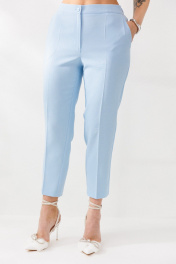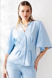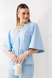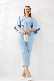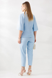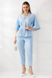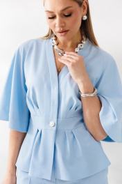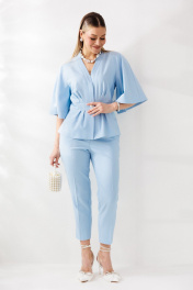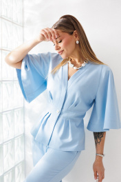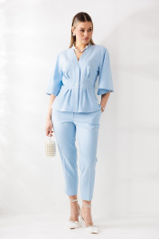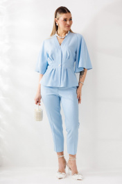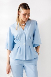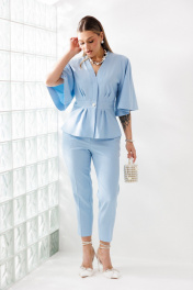 Костюм женский, состоящий из жакета и брюк, выполнен из костюмной ткани (чуть тянется). Жакет полуприлегающего силуэта с отрезным поясом и баской. По лифу переда и баскам односторонние складки. По лифу спинки талиевые вытачки. Горловина оформлена V-образным вырезом с отрезными планками. Застежка центральная на пришивные кнопки и отделочную пуговицу по поясу. Рукава покроя «реглан» расширенные к низу. Жакет без подкладки. Брюки с высокой посадкой, зауженные к низу, длиной 7/8. По срезу банта – застежка-молния. В боковых швах наклонные карманы. Верхний срез оформлен поясом с резинкой по задней половинке.